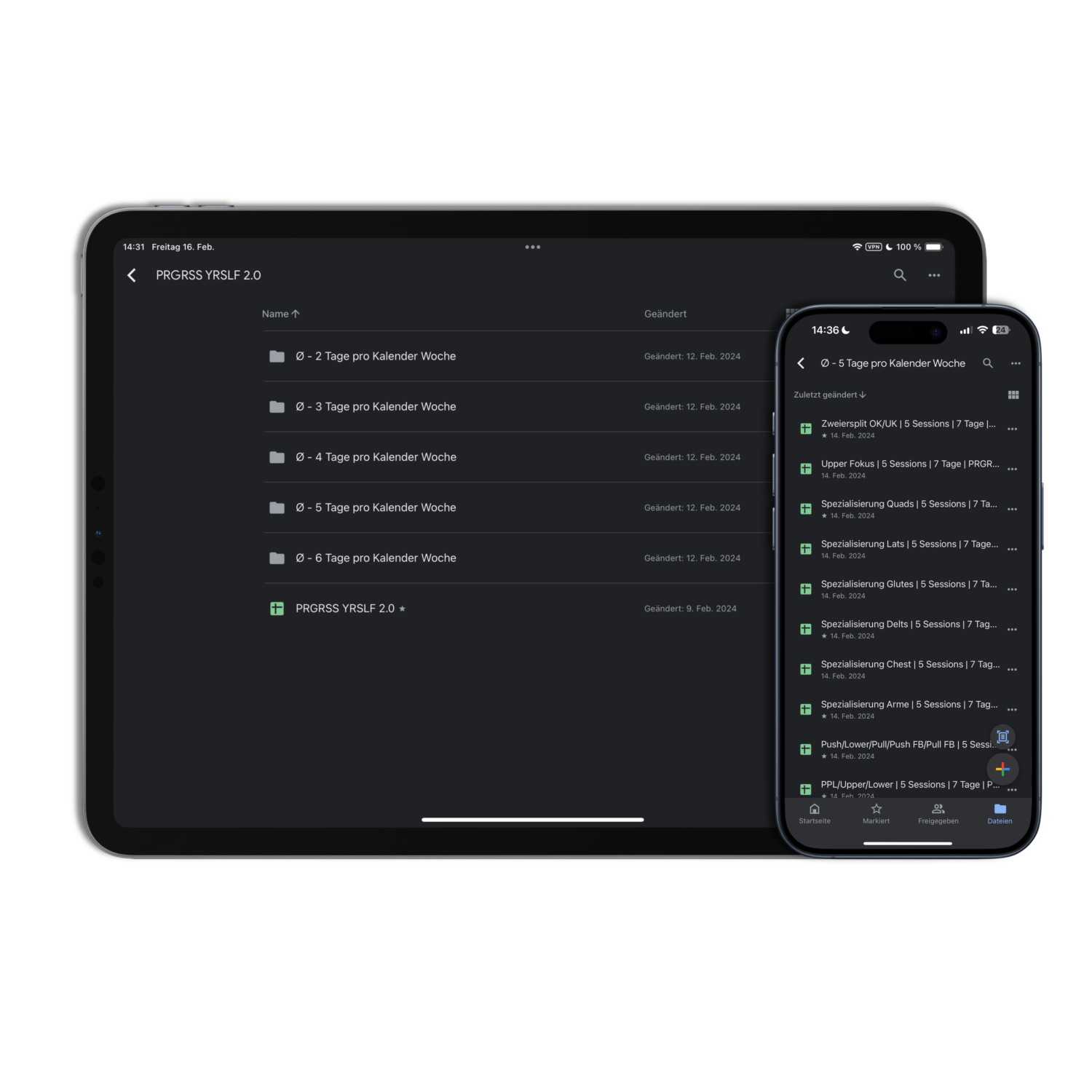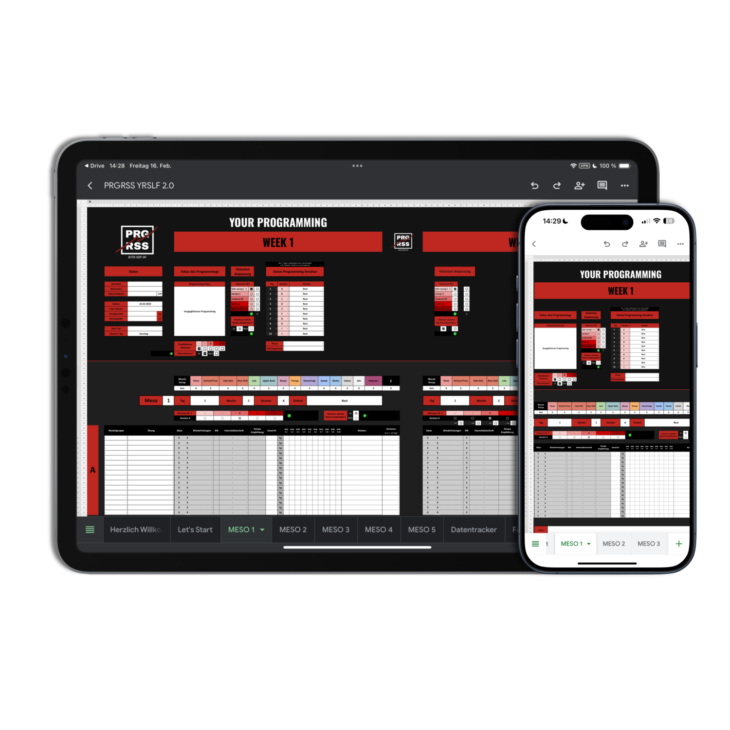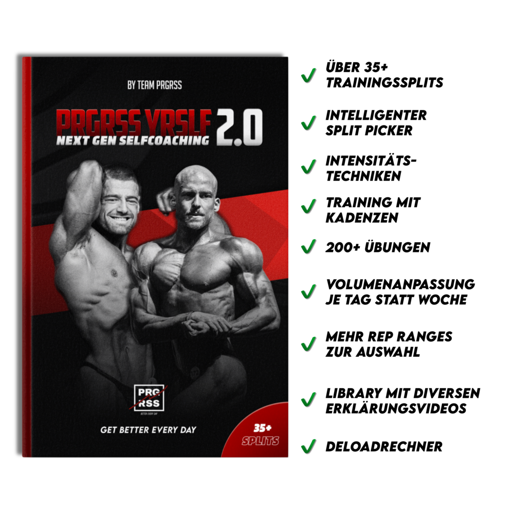 PRGRSS YRSLF 2.0 hat nun 35 statt 20 Pläne. Egal ob für eine 7-Tages-Woche, 6 oder 8 Tage. Egal ob 2 , 3, 4, 5 oder 6 Einheiten in der Woche. Egal ob dein Fokus der Lat oder der Unterkörper ist. Keine Lebenslage, Situation oder Präferenz bleibt offen. Und das Beste: Weitere Splits werden folgen.