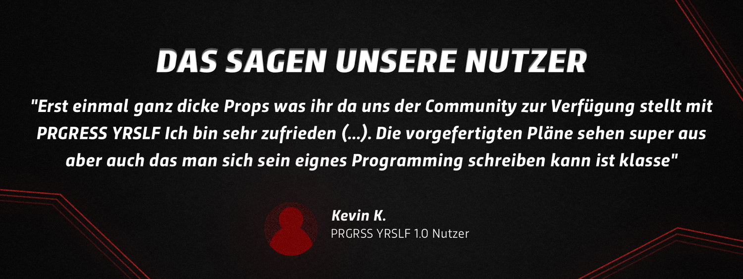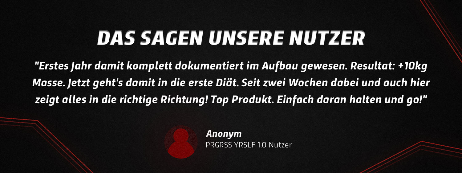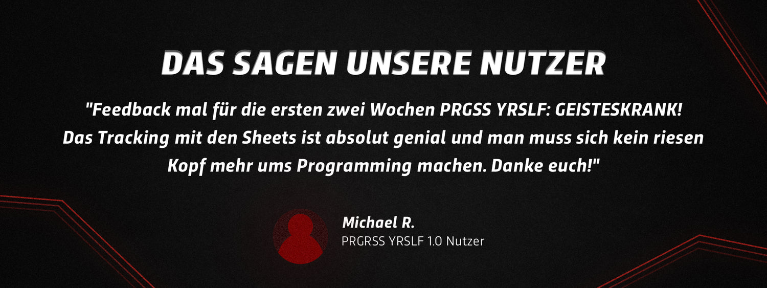 Über 100 Nutzer von PRGRSS YRSLF 1.0 haben bereits ihre Bodybuilding- und Fitnessziele erreicht. Mit dem Upgrade auf Version 2.0 bieten wir genau das Werkzeug, das du benötigst, um die gleichen Erfolge zu erzielen. Worauf wartest du noch? Mach die Fortschritte deines Lebens mit PRGRSS YRSLF!