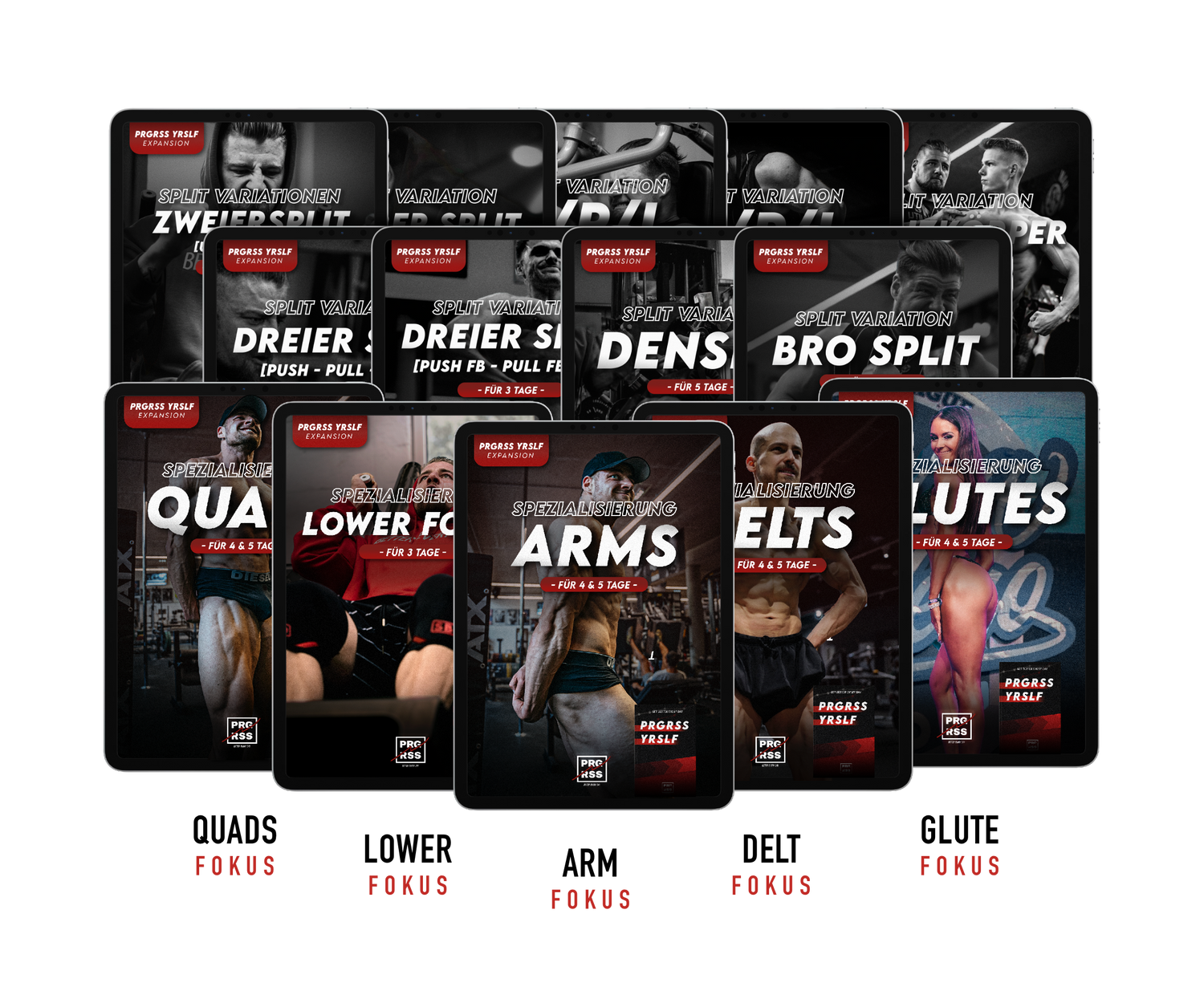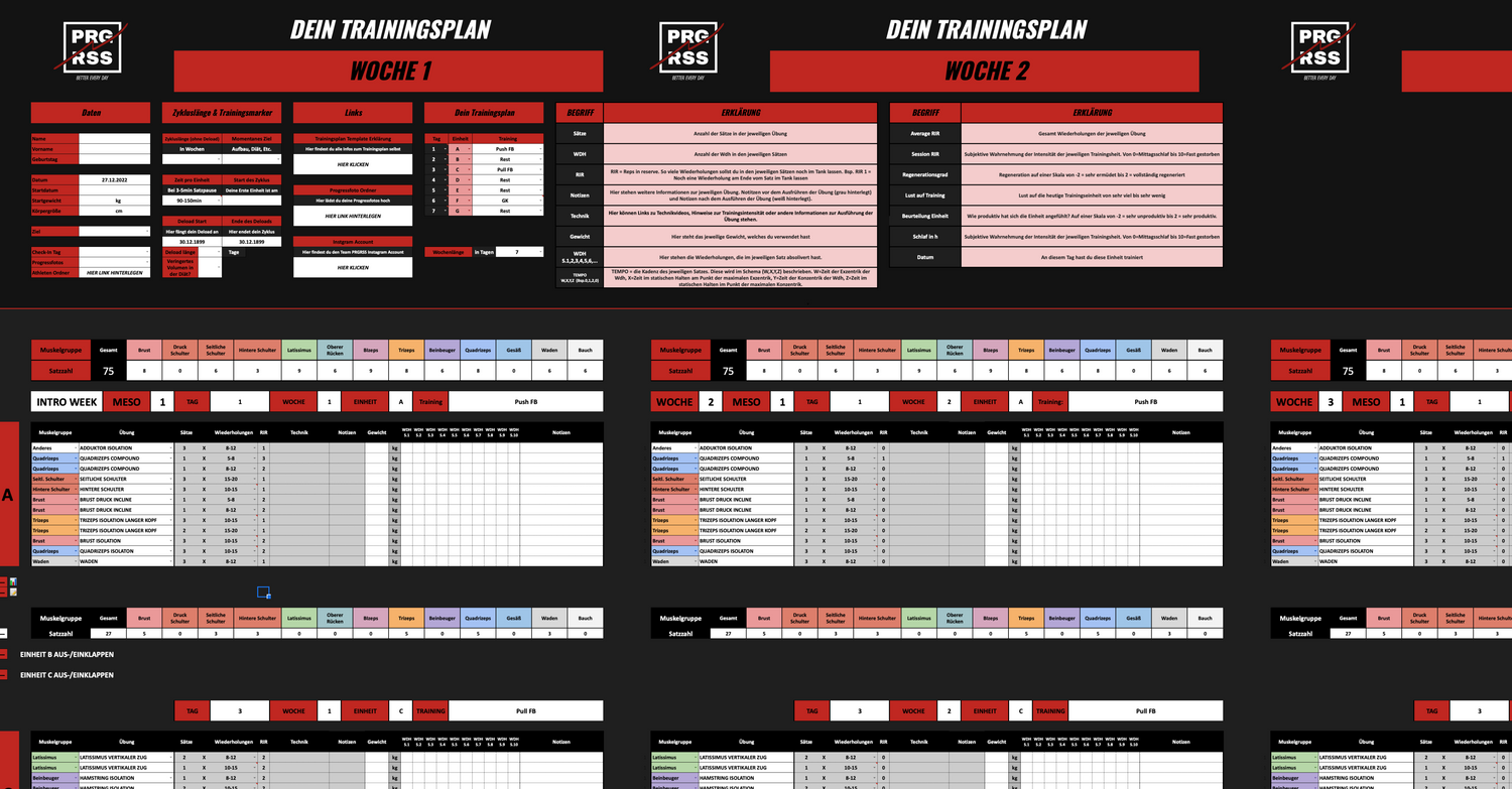 Egal ob du 2,3,4,5 oder sogar 6 mal die Woche trainieren möchtest: PRGRSS YRSLF bietet genau das richtige Trainingssystem für dich und deine Ansprüche. Mit 12 verschiedenen Trainingsplänen kannst du genau den Ansatz wählen der zu dir und deinen Möglichkeiten passt.