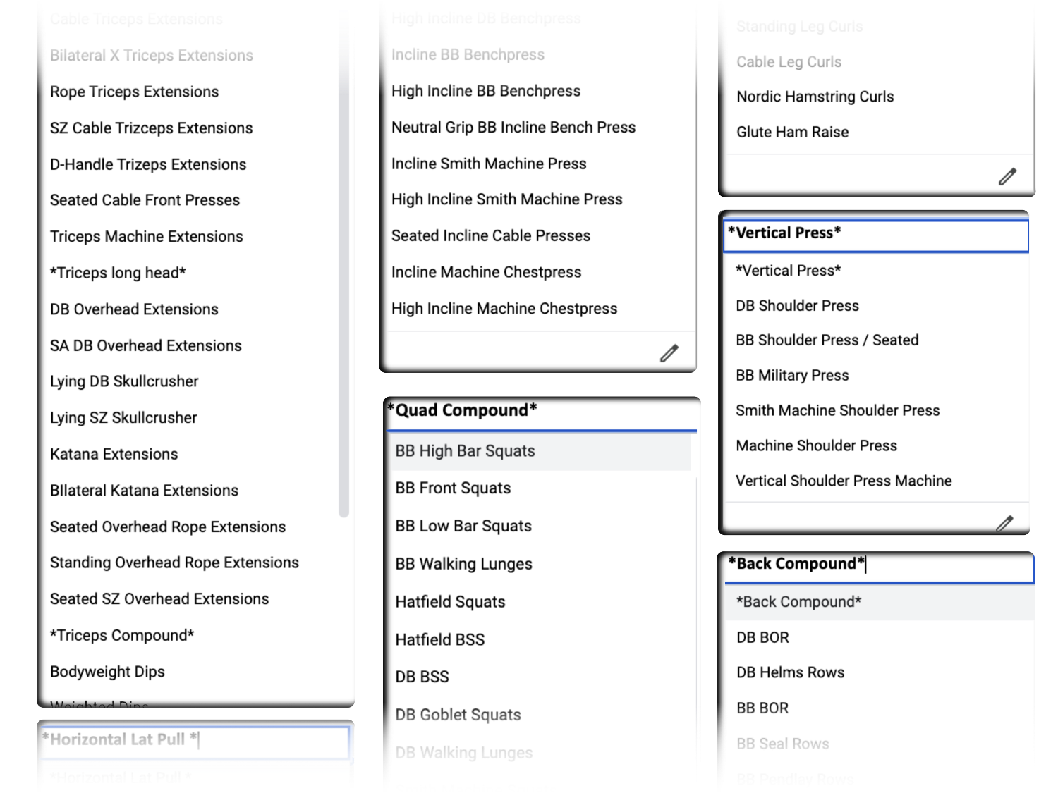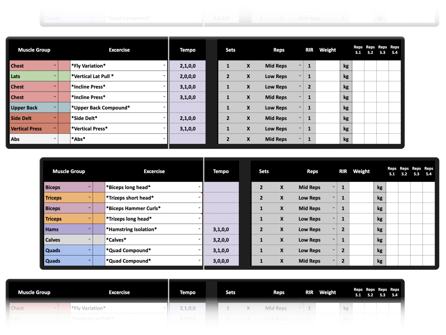 TRAIN YRSLF PRO bietet jetzt noch mehr verschiedene Übungen, aufgeteilt in 41 zur Auswahl stehenden Übungsgruppen. Das ermöglicht uns einen extrem hohen Grad an komplexität und detailumfang in die Trainingsplanung zu integrieren. Abgerundet wird diese von RIR Vorgaben, Intensitätstechniken und Top-/Back-off Satz Schemata.