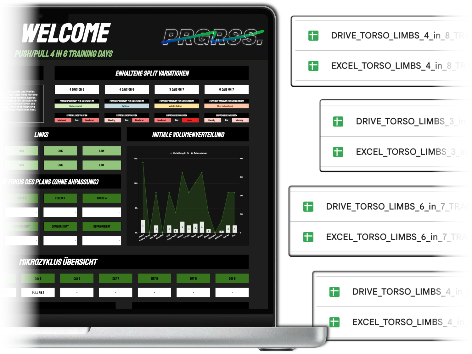 TRAIN YRSLF PRO ist auf Google Drive, Microsoft Excel und via PDF Ansicht/Datei nutzbar. Um eine vollumfassende Benutzbarkeit der Excel Version zu gewährleisten haben wir sie in ihren Funktionen eingeschränkt. Die Basis des Programs ist aber nach wie vor vollständig nutbar. Diese Version kannst du dir nach dem Kauf entweder herunterladen oder selbstständig exportieren. Sobald die Zahlung bei uns eingegangen ist wird dir das Produkt binnen 24h an deine angegebene E-Mail Adresse freigegeben. Sende uns im Bestfall direkt deine Google E-Mail Adresse mit.